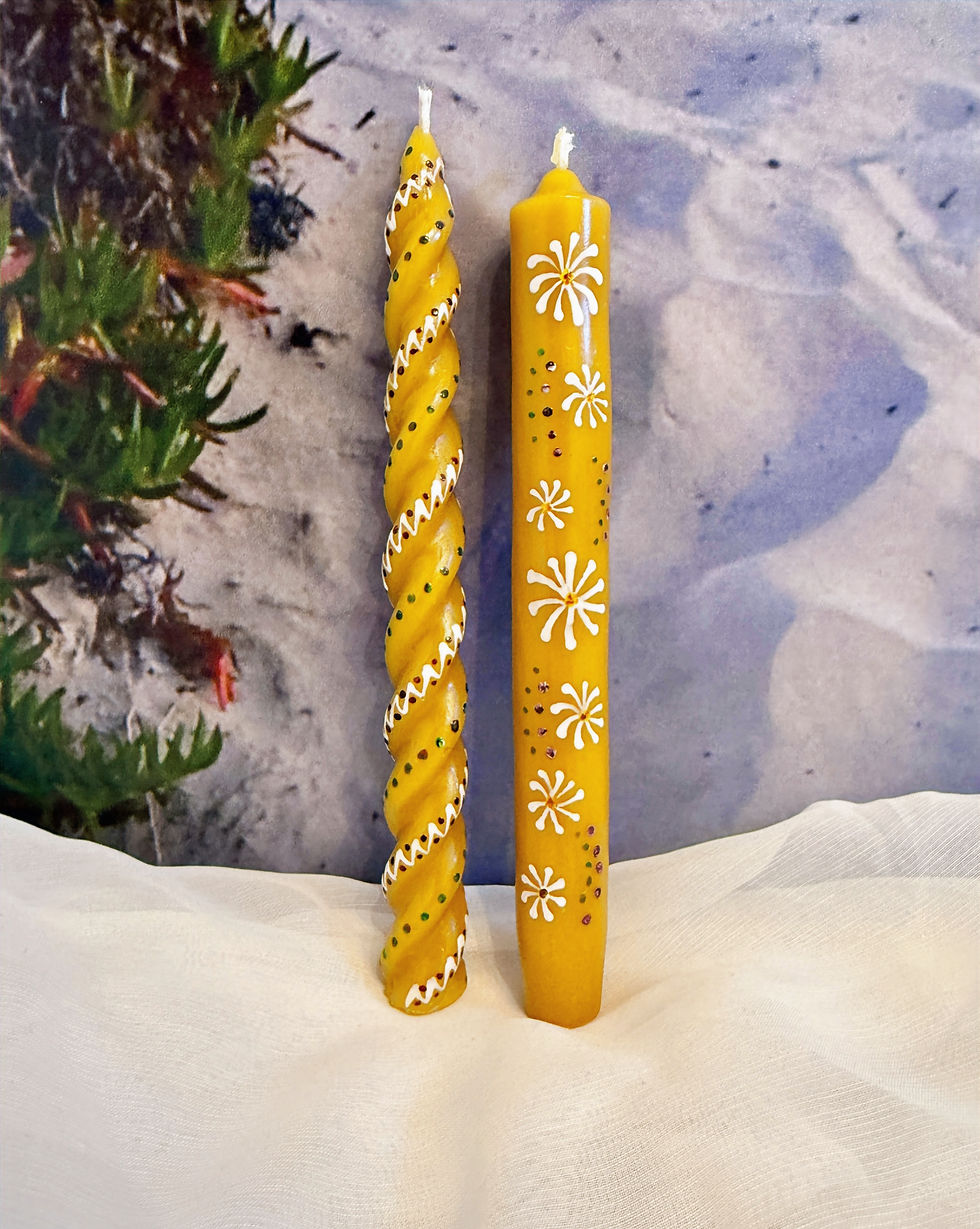 Hier finden Sie handverzierte und handbemalte Bienenwachskerzen aus Handarbeit. Die Kerzen sind aus regionalem naturreinen Bienenwachs gegossen und überzeugen durch ihren einzigartigen Geruch, die goldgelbe Eigenfarbe des Bienenwachses und die schönen Motive, die sie zu einem echten Hingucker machen.